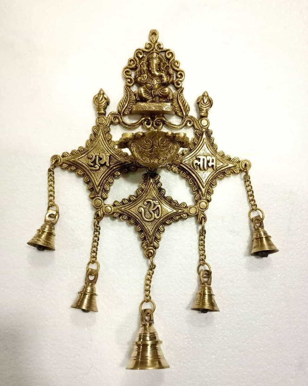 This religious wall hanging in brass with a chain is handcrafted by artisans from south India.Lord Ganesha is widely revered as the remover of obstacles, the patron of arts and sciences and the Deva of intellect and wisdom. As the god of beginnings, he is honoured at the start of rituals and ceremonies.
