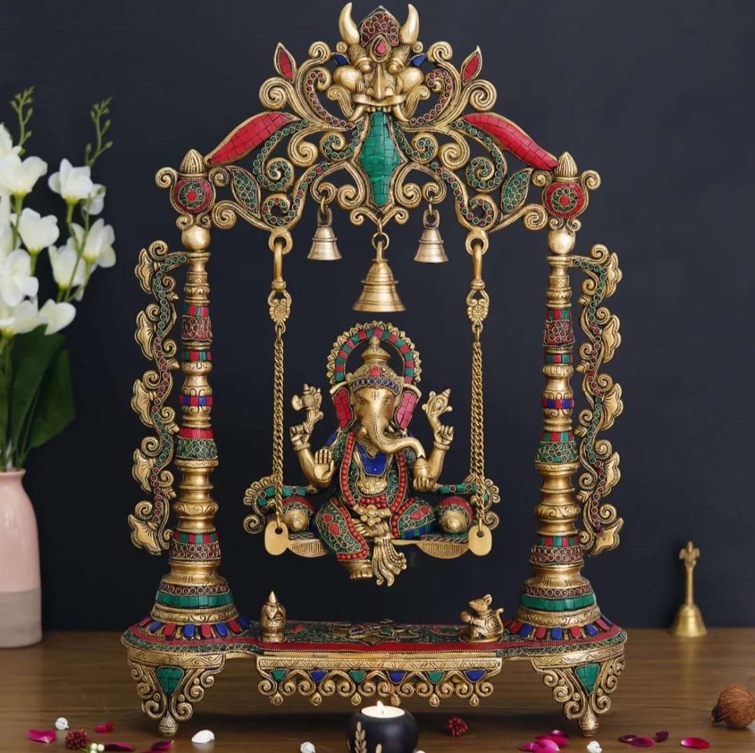 Lord Ganesha On Decorated Swing Handcrafted Brass Idol with Stone Work
