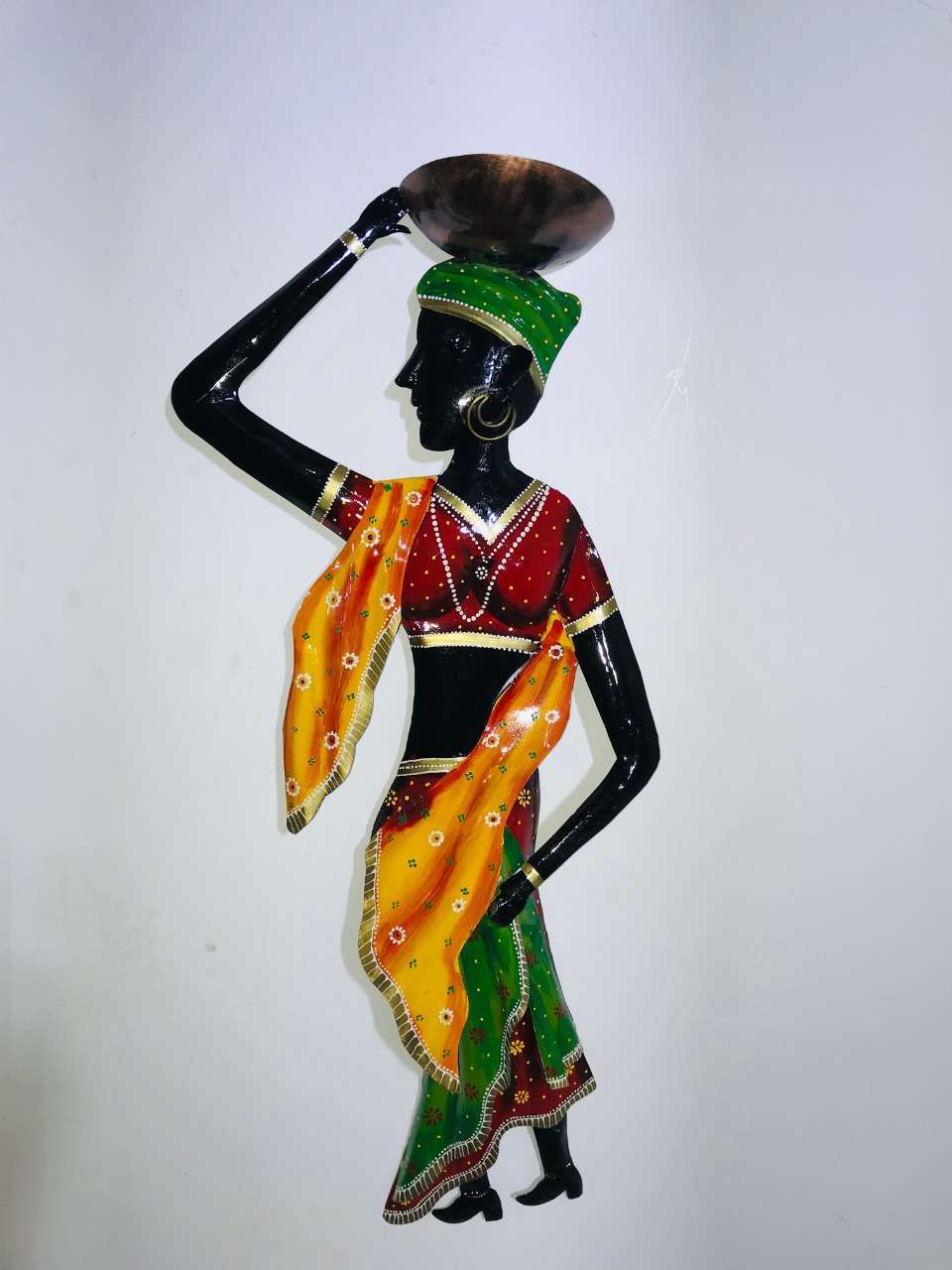 A wide range of home design goods is available at Flickkerbox. Metal Lady Wall Hanging is among many items that have a distinctive look. With its vivid hue, this is a great way to bring vitality and color to your walls. The wall décor is constructed of metal and is proven to endure a very long time indeed. A black shining hue has been applied to this item, which is finished with high-quality paint. The multicolor used in this piece makes it look aesthetic and colorful. The lady is depicted carrying a pot over her head as the woman does in villages. It looks very serene.