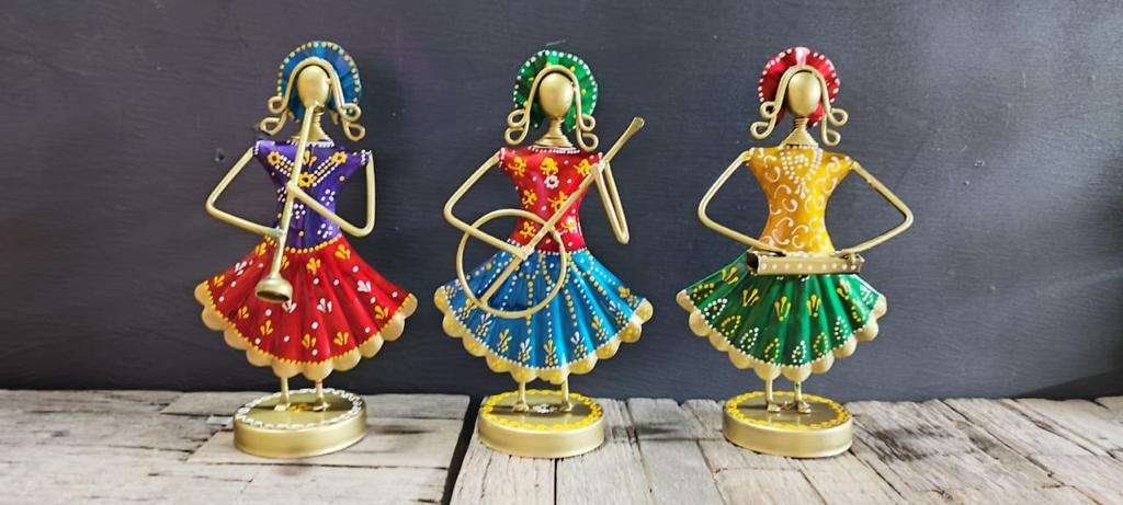 Metal tribal lady musicians’ decorative show pieces are items used to add an ethnic touch to home decor. These show pieces typically depict women playing musical instruments, such as drums or flutes, and are often made of metal, such as brass or bronze. The tribal theme often draws inspiration from traditional cultures and musical styles from around the world, giving these pieces a unique and exotic look.Regardless of style, metal tribal lady musicians’ decorative show pieces are often treasured for their cultural significance and unique beauty, making them a popular choice for home decorators and collectors alike. They can be used to add a touch of personality and cultural flair to any room in a home or office, and are often displayed on shelves, mantels, or desks.